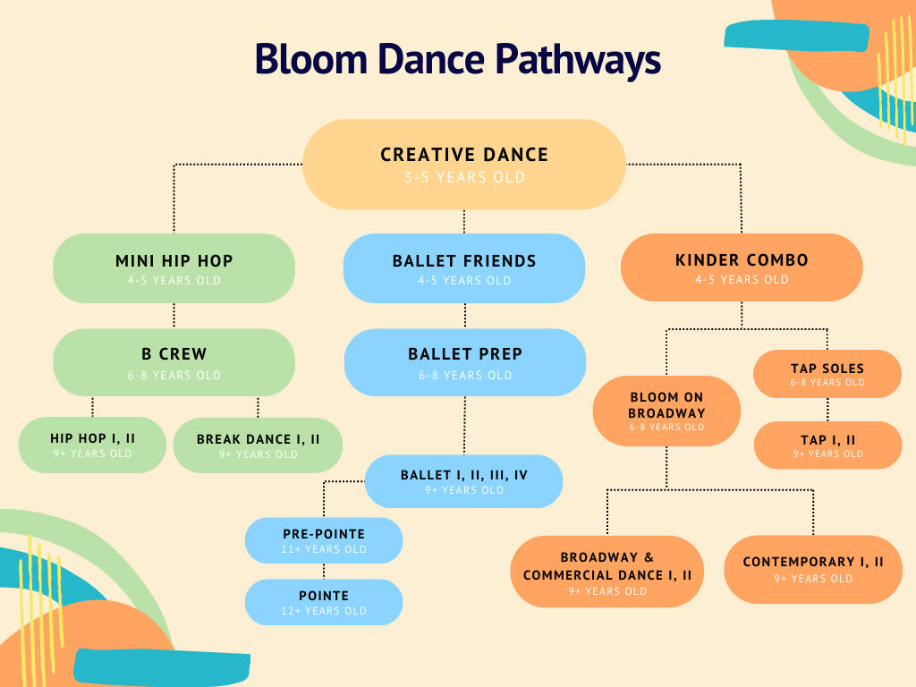 Bloom’s dance program is designed to support dancers from the age of 3 to 18 years old.Students may begin their journey in dance at any time and are welcome to explore all of our dance pathways.All of our classes are taught as mixed level classes to help foster leadership skills and create a more collaborative and inspirational learning environment.